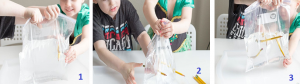 KİLİTLİ BUZDOLABI POŞETİNİ YARISINA KADAR SUYLA DOLDUR. SONRA UCU SİVRİ KURŞUN KALEMLERİ DİK ŞEKİLDE SULU TARAFTAN DİĞER TARAFA POŞETİ DELEREK GEÇİR.