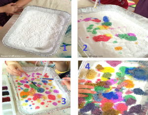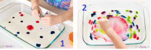BİR BÜYÜKÇE KABIN İÇİNE SÜT KONUR İÇİNE ÇEŞİTLİ RENKLERDE GIDA BOYASI DAMLATILIR…BUNA BİRAZ BULAŞIK DETERJANI EKLENİR VE BİR PAMUK PARCASI KONUR 15 DAKİKA BEKLENİR VE COCUK PAMUKLA YADA BİR KÜRDANLA ÇEŞİTLİ ŞEKİLLER VERİLİR …