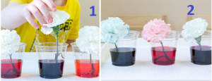 5-6 ADET PLASTIK BARDAĞIN HERBİRİNE YARISINA KADAR SU KOY VE HERBİRİNE AYRI BİR RENK GIDA BOYASI EKLE KARIŞTIR. SONRA BU BARDAKLARIN HER BİRİNE BİR BEYAZ KARANFIL TARZI ÇICEK KOY VE SUYUN RENGİNİ NASIL ALDIKLARINI İZLE…