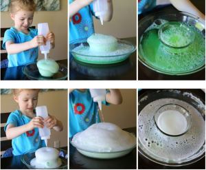 BİR KASE VEYA TABAĞA BİRAZ SÜT KOYUN VE BUNA BİRKAÇ DAMLA YEMEK BOYASI EKLEYİN .SONRA BULAŞIK DETERJANI KONUR VE KÜRDANLA BU KARISIM KARISTIRILDIĞINDA RENKLERİN NASIL BİR ŞEKİL ALDIĞI VE NEDENİ ÇOCUĞA ANLATILIR… GÜZEL VE GÖRSELLİĞİ ÇOK İYİ BİR DENEY.